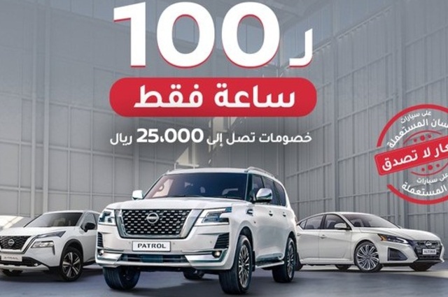 وقالت الشركة أنها توفر العرض لمدة 100 ساعة فقط بخصومات تصل الي 25 ألف ريال. وأكدت توفر العرض في معارض الشركة المختلفة. وقالت الشركة أن العرض على سيارات نيسان المستعملة المعتمدة فقط ويمتد الي 19 مايو 2024 .