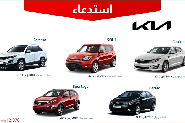 كشفت وزارة التجارة في المملكة العربية السعودية عن استدعاء جديد شمل العديد من سيارات كيا المتوفرة بالسوق السعودي. وشمل الاستدعاء عدد 12.978 ألف مركبة من طرازات مختلفة تتضمن الموديلات التالية بين طرازات 2010 و2015 :