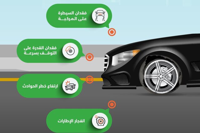 وطالب المرور بضرورة التحقق بانتظام من إطارات المركبات من أجل تقليل مخاطر حوادث الطرق محدداً بعض الأمور التي يجب التعامل معها في هذه الحالة كالتالي والتي تأتي بسبب الاخلال بالاطارات :