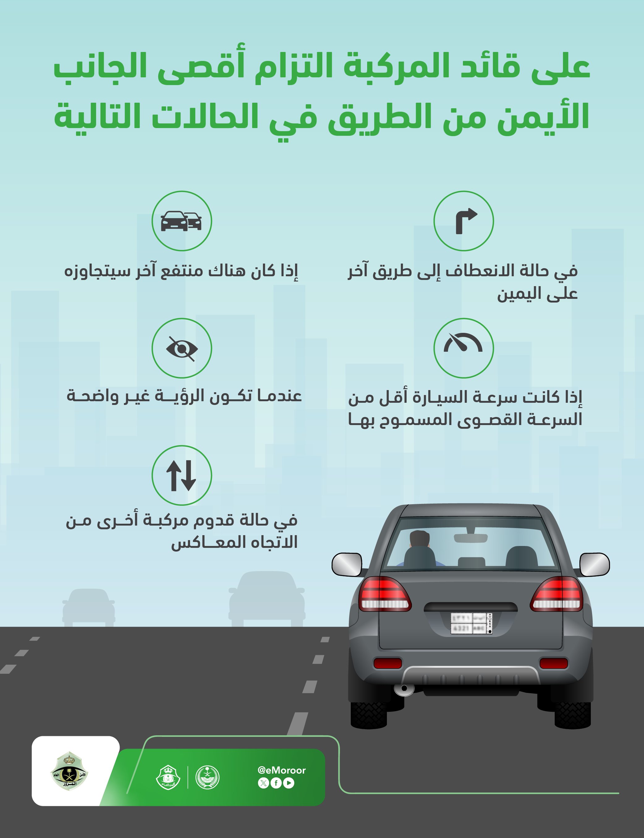 ومن جانب آخر , طالب المرور بالالتزام بأقصي الجانب الأيمن من الطريق في عدد من الحالات التي وضحها كالتالي :