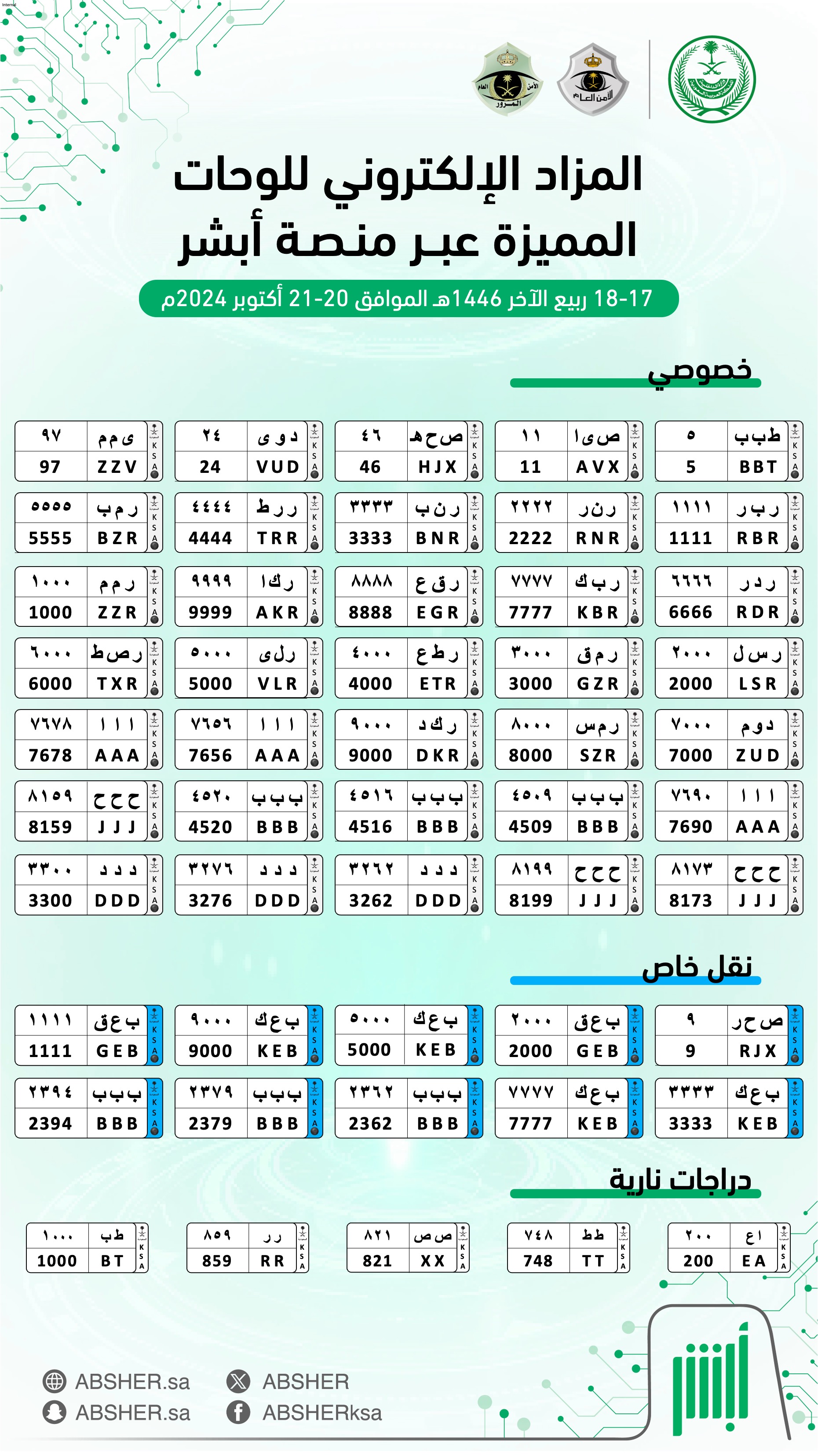 أعلنت منصة أبشر في المملكة العربية السعودية عن مزاد جديد على عدد من لوحات السيارات المميزة. وقالت أن اللوحات تشمل سيارات خصوصي للركاب وسيارات نقل خاص ودراجات نارية. وبدأ المزاد أمس الأحد الموافق 20 أكتوبر 2024 الموافق 17 ربيع الآخر 1446 هجرياً الساعة 8 صباحاً. ويستمر المزاد لليوم الاثنين 21 أكتوبر 2024 الموافق 18 ربيع اللآخر حتى الساعة العاشرة مساءً.